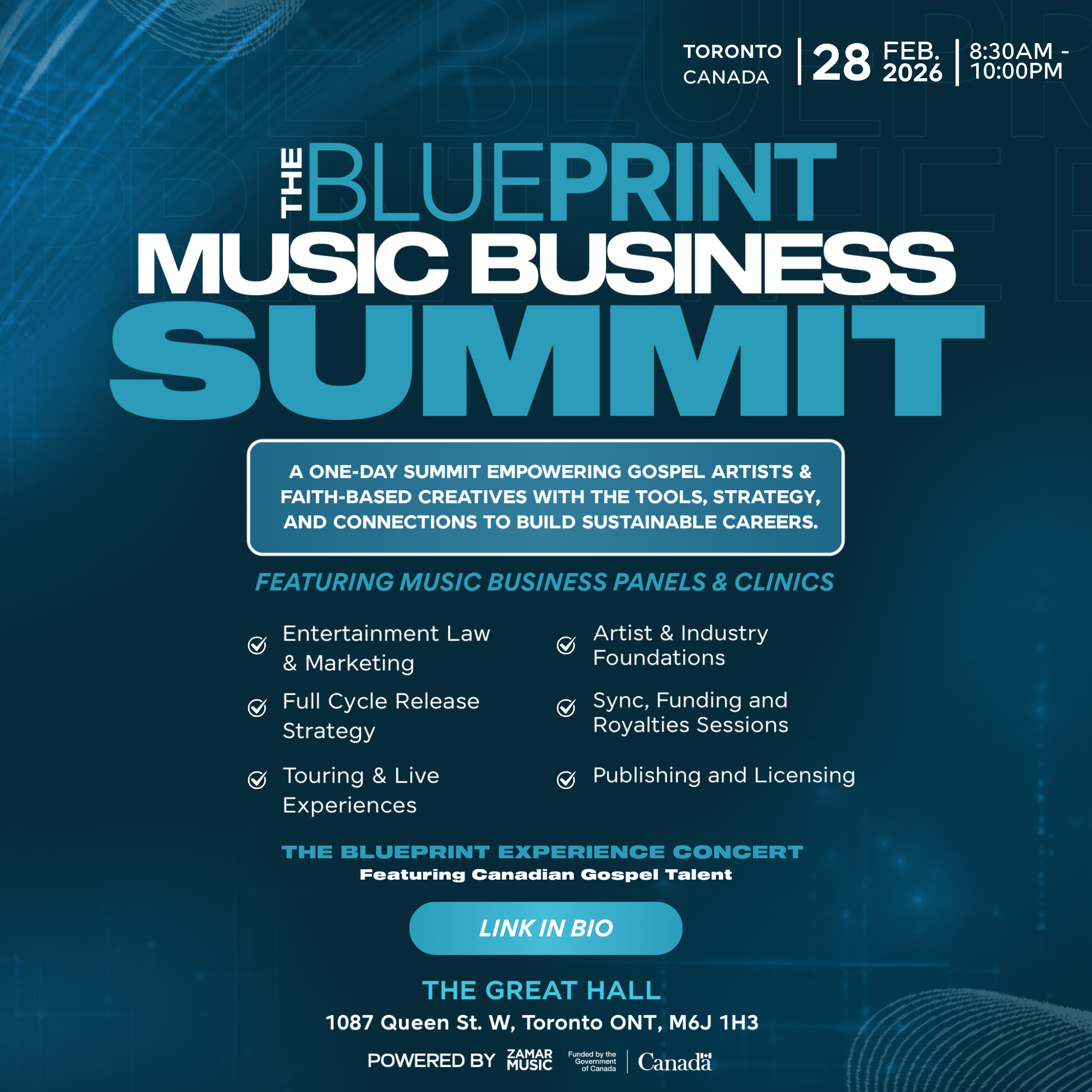 Hosted by Zamar Music at The Great Hall in Toronto, The Blueprint brings together emerging and established gospel talent with industry experts, educators, and creatives for an immersive day rooted in real-world strategy, education, and